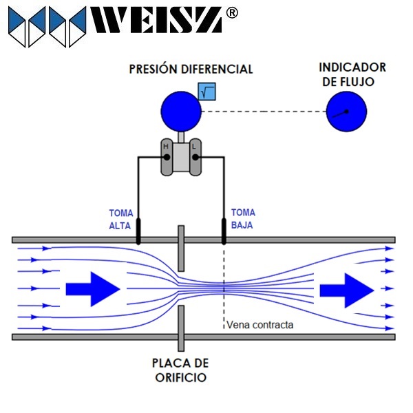La placa de orificio es un dispositivo que permite medir el caudal de un fluido que pasa por una tubería. Consta de un disco con un orificio en el centro de este que se coloca perpendicular a la tubería.